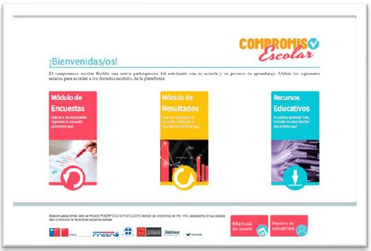 La plataforma tecnológica versión 2.0, para la medición de CE y los factores contextuales, es un sistema Web disponible en www.compromisoescolar.com. Como muestra la Figura 1, la plataforma de evaluación de CE versión 2.0 incluye tres módulos: Encuestas, resultados y recursos educativos.
