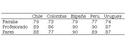 - Cuestionario de Factores Contextuales. Desarrollado por Universidad de la Frontera y la Universidad Autónoma (2016). Es un cuestionario que valora 3 dimensiones del contexto de los/as estudiantes: familia (3 ítems), profesorado (8 ítems) y pares (7 ítems). Los 18 ítems se encuentran en escala tipo Likert de 5 puntos (desde 1: nunca o casi nunca hasta 5: siempre o casi siempre). El instrumento presenta evidencia a favor de la validez estructural en los 5 países (Tabla 3), con valores de RMSEA=.053-.098, CFI=.933-.993 y TLI=.915-.984 y buenos índices de fiabilidad como consistencia interna (Tabla 4) con valores de omega entre .73 y .79 para el factor contextual familia, entre .86 y .90 para el factor contextual profesorado y entre .77 y .90 para el factor contextual pares. Cabe señalar que la estructura del cuestionario fue distinta entre los países (ver artículo de validación en esta misma edición).