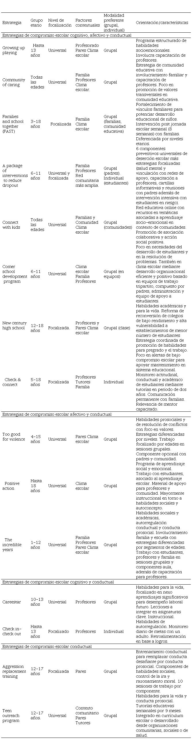 La mayoría de las estrategias de promoción de CE identificadas provienen de países angloparlantes, particularmente de Estados Unidos (40 de 43), y solo dos iniciativas provienen de Portugal (Growing up playing) y Brasil (A package of interventions to reduce the dropout). Profundizando en los resultados del análisis de las 15 estrategias valoradas como pertinentes y aplicables al contexto chileno por el juicio de expertos, la Tabla 1, organiza las estrategias de acuerdo a la o las dimensiones del CE que abordan (cognitivo, afectivo y conductual). A su vez entrega información respecto del nivel de focalización (universal o focalizada), sus principales características, el o los factores contextuales del CE que considera, el grupo etario al que se orienta y la modalidad preferente con la que trabaja (grupal, individual).
