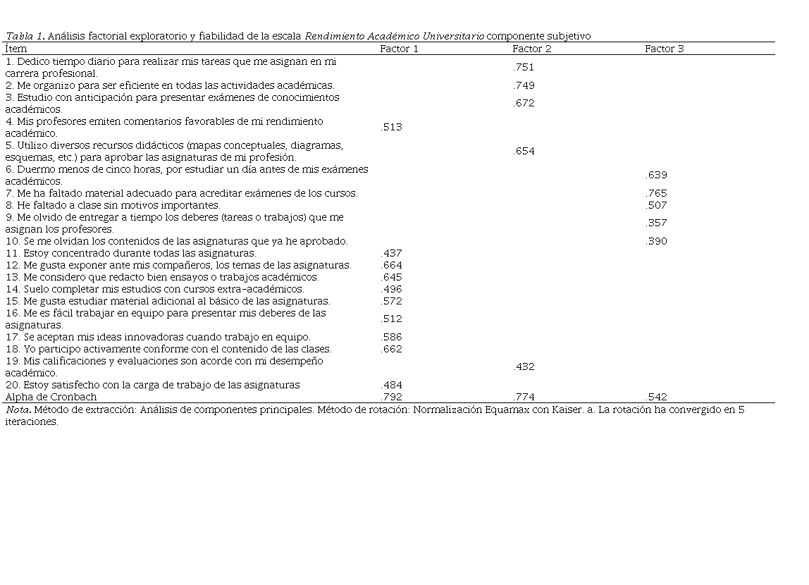 La Tabla 1 muestra las cargas factoriales de los componentes rotados después de cinco iteraciones y la consistencia interna con el coeficiente alpha de Cronbach. Los resultados mostraron que en dos de los tres factores, se encontró una consistencia interna aceptable (F1 α=.792; F2 α=.774) y en el Factor 3, una consistencia interna de α=.542, considerada como moderada (Tabla 1).