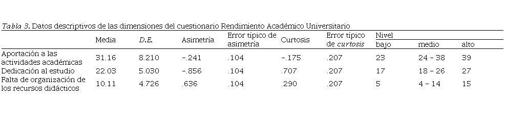 Con la finalidad de que el cuestionario Rendimiento Académico Universitario (RAU) pueda ofrecer un grado de valoración, se ofrecen los valores descriptivos en la Tabla 3 en este grupo de referencia; así el nivel bajo correspondería a la diferencia de una desviación estándar respecto de la media y el nivel alto con la suma correspondiente.