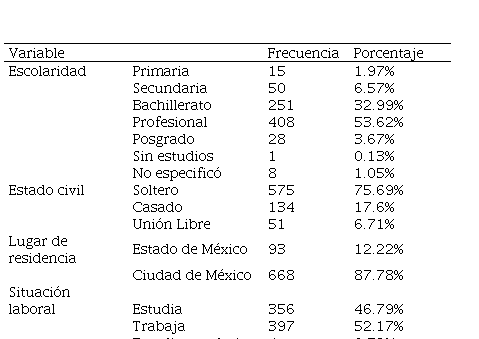 Participaron 761 adultos de 18 a 75 años (.=29.22, DE=12.21), 338 hombres (44.4%), 409 mujeres (53.7%) y 12 (1.6%) no especificaron (ver Tabla 1). El criterio de inclusión fue habitar en la ciudad de México y área conurbada (al menos un año). El criterio de eliminación fue responder menos del 80% del instrumento. En todo momento se respetaron los aspectos del código ético del psicólogo para resguardar la dignidad de los participantes, confidencialidad de la información, consentimiento informado, no ofrecer incentivos inapropiados, informar posibles riesgos de la investigación y solicitar solo información básica pertinente para el estudio (Sociedad Mexicana de Psicología, 2009).