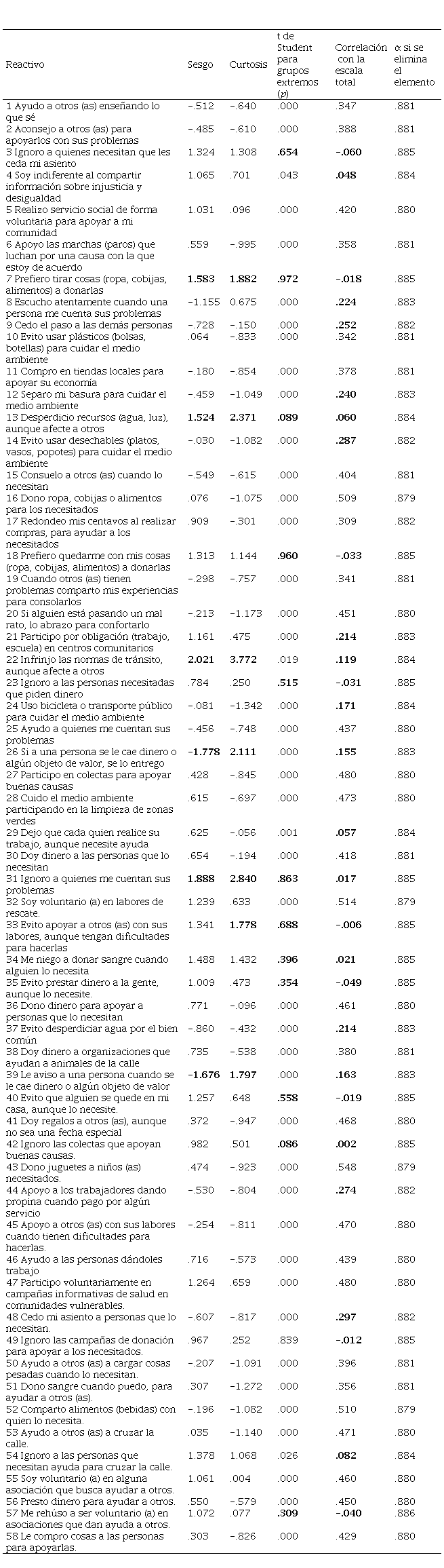 En primer lugar, se realizaron cinco análisis para evaluar el funcionamiento de los ítems en cuanto a su discriminación y aporte a la consistencia interna del instrumento para determinar qué reactivos serían sometidos al análisis factorial exploratorio: Primero se llevó a cabo un análisis de frecuencias para cada reactivo con el fin de verificar que todas las opciones de respuesta hayan sido elegidas por los participantes. Posteriormente, para comprobar el supuesto de normalidad de las variables, sé calculó el sesgo y curtosis de cada reactivo buscando valores entre ±1.5 (George & Mallery, 2001). Después, para identificar si los reactivos distinguen entre niveles altos y bajos del rasgo latente, se empleó prueba . de Student entre grupos extremos y la correlación entre el reactivo y el total de la prueba (índice de homogeneidad corregido) buscando valores superiores a .30. Por último, se obtuvo el alfa de Cronbach de la escala total y si al eliminar un reactivo éste aumentaba considerablemente el valor, la afirmación seria eliminada. Si un reactivo incumplía dos o más de los cinco criterios anteriores, seria descartado de los análisis posteriores. En este paso fueron eliminadas ocho afirmaciones (ver Tabla 2).