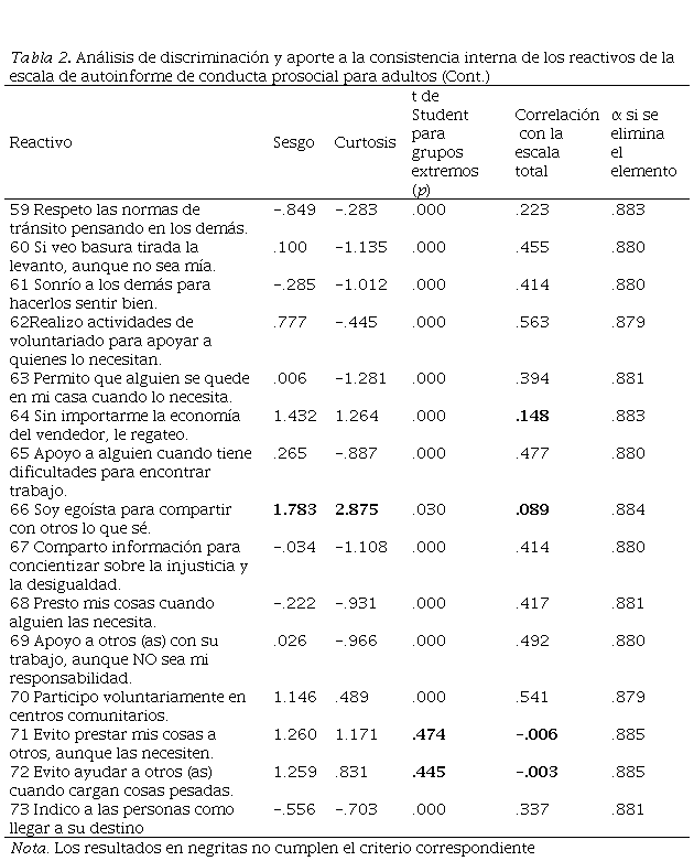 En adultos, Auné, Abal y Attoresi (2016) construyeron una escala para adultos que incluye comportamientos empáticos, altruismo, ayuda, compartir y donar. Las afirmaciones incluidas contemplan combinaciones entre conducta y motivación o situación y aunque está dirigida hacia adultos, gran parte de las acciones están enfocadas al contexto escolar universitario. Posteriormente, en una revisión de la escala, solo conservaron reactivos referentes a conductas (Auné et al., 2019). Es importante mencionar que, aunque los autores consideran la empatía como un comportamiento, Batson (2011) menciona que la empatía es más bien una motivación que promueve la respuesta prosocial.