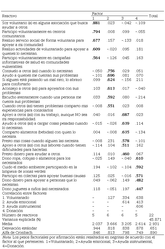 Resumen: La evaluación de la conducta prosocial está dirigida principalmente hacia niños y adolescentes. Aquellas escalas enfocadas en adultos son dirigidas a estudiantes o evalúan motivaciones y situaciones subyacentes. Por lo tanto, el propósito del presente estudio fue desarrollar una escala de autoinforme para evaluar la conducta prosocial en adultos y obtener sus propiedades psicométricas (dimensiones, validez predictiva y confiabilidad). Participaron 761 personas de 18 a 75 años (.=29.22, DE=12.51). La escala quedó compuesta por 22 reactivos distribuidos en 4 factores, con un alfa de Cronbach de .89 y 45.8% de varianza explicada. Los resultados muestran que la escala es adecuada para evaluar de manera valida y confiable la conducta prosocial en adultos de población abierta de la ciudad de México.
