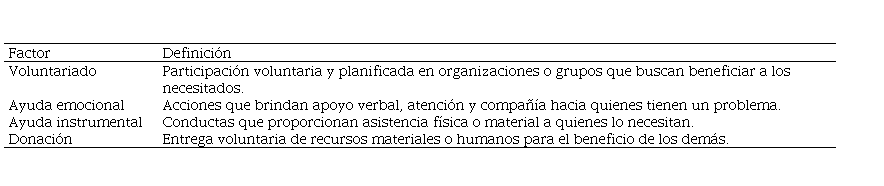 En relación con las limitaciones del estudio, la presente investigación se enfocó en obtener una escala de autoinforme que evalúa únicamente conductas, sin embargo, la motivación y situación son elementos que forman parte del constructo (De La Cruz & Rivera-Aragón, en prensa), por lo que el siguiente paso de la investigación es continuar con la construcción y análisis psicométricos de las escalas de motivaciones y situaciones prosociales. En futuras investigaciones es necesario realizar un análisis factorial confirmatorio para proporcionar mayor evidencia de la validez de constructo de la escala.