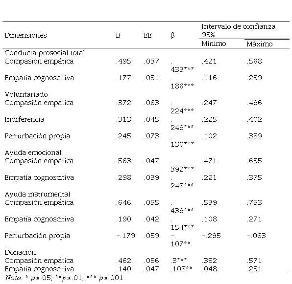 Para la conducta prosocial total el primer paso de la regresión fue significativo (. [1,757]=245.701, .<.001) e incluyó la compasión empática que explicó el 24.4% de la varianza (R.=.245, R. ajustada=.244). El segundo paso de la regresión fue significativo (. [2,756]=143.931, .<.001) y se incorporó la empatía cognoscitiva (R.=.276, R. ajustada=.274, ΔR.=.031). En conjunto, la compasión empática y la empatía cognoscitiva explicaron el 27.4% de la varianza.