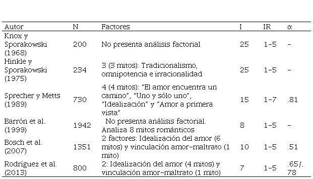 Para poder realizar dicha labor, se requiere una taxonomía precisa y amplia de mitos románticos y escalas que los evalúen. En la Tabla 1 se pueden observar los principales instrumentos (y estudios psicométricos) localizados referentes al análisis de los mitos románticos. De ellos aportan datos de validez estructural los trabajos de Hinkle y Sporakowski (1975), Sprecher y Metts (1989), Bosch et al. (2007) y Rodríguez et al. (2013). Se echan en falta escalas que engloben un mayor número de mitos románticos.