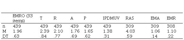 Se obtienen otras correlaciones significativas: EMR-EMA (r=.79, p<.01), EMR-RAS (r=-.27, p<.01), EMR-IPDMUV (r=.19, p<.01), EMA-RAS (r=-.22, p<.01), EMA-IPDMUV (r=.25, p<.01).