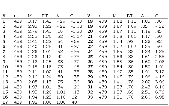1) Escala de Mitos Románticos (EMRO). Evalúa 33 mitos. Se crean 99 ítems (3 ítems por mito). En una primera fase de análisis de los ítems se selecciona 1 por mito teniendo en cuenta los siguientes criterios: en primer lugar, el examen de los estadísticos descriptivos (eligiendo aquellos reactivos con medias más altas y valores de asimetría y curtosis con mejor ajuste a la curva normal) y, en segundo lugar, el análisis teórico (valorando que el ítem elegido a partir de los estadísticos descriptivos también recoge de forma rigurosa el contenido del mito). La escala resultante está compuesta por 33 ítems con un formato de respuesta tipo Likert en un rango 1-5 (grado de acuerdo con el enunciado). El instrumento puede ser consultado en el Apéndice del artículo.