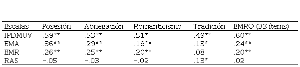 Como se aprecia en la Tabla 4, existen correlaciones significativas de la EMRO y tres de sus factores (Posesión, Abnegación y Romanticismo) con todas las medidas criterio salvo con la de satisfacción. De este modo, tanto los pensamientos sexistas y de legitimación de la violencia (IPDMUV) como el maltrato (EMA y EMR) parecen estar relacionados de algún modo con la creencia en los mitos románticos, especialmente con el factor Posesión. El único factor de la EMRO que muestra una relación significativa con la satisfacción, y una escasa (o nula) relación con las conductas de maltrato, es “Tradición”.