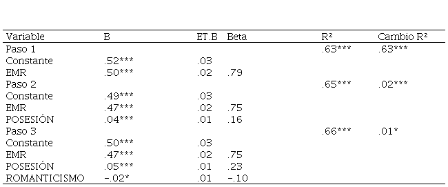 Se obtiene una correlación directa y positiva (aunque reducida) entre el romanticismo y el maltrato agente (r=.19, p<.01), mientras que en el análisis de regresión es un predictor significativo (junto a Posesión y el maltrato receptor) con valor Beta negativo (-.10) de la ejecución del maltrato. Debido a la ambivalencia y la reducida magnitud de los resultados, se requiere más investigación ulterior para poder dar entidad y una explicación rigurosa a estos datos. Es imperativo señalar que el predictor principal del maltrato agente es, con diferencia, el maltrato receptor, con un valor Beta positivo muy elevado, lo cual denota la fuerte relación entre recibir y ejercer maltrato en nuestra muestra de estudio.