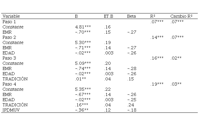La Tradición es el único predictor de la satisfacción con valor Beta positivo en el análisis de regresión, de tal manera que el recibir maltrato, la edad y el IPDMUV presentan un valor negativo. Esto denota la estrecha relación entre maltrato e insatisfacción (como parecería evidente), que a mayor edad existiría una mayor insatisfacción, y que el sexismo y la justificación del maltrato se relacionan con un menor bienestar en la pareja.