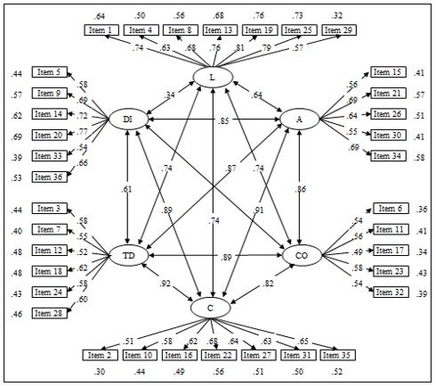 A continuación (submuestra: .=300), para ratificar la orientación de los ítems y verificar las relaciones entre los seis factores, nos hemos basado en la distribución obtenida por O'Neil et al. (1997) que es similar a la alcanzada con el AFE de la muestra actual. Se propuso el modelo inicial de medida establecido por O’Neil et al. (1997) (Figura 1), que consta de 6 variables latentes (A: adaptabilidad, CO: coordinación, TD: toma de decisiones, L: liderazgo; DI: destrezas interpersonales, C: comunicación) y 36 variables observadas (ítems). Al especificar el modelo se observan cargas factoriales satisfactorias en todos los ítems (valores superiores a .50 indicado por Byrne, 2010), por lo cual no fue eliminado ningún ítem.