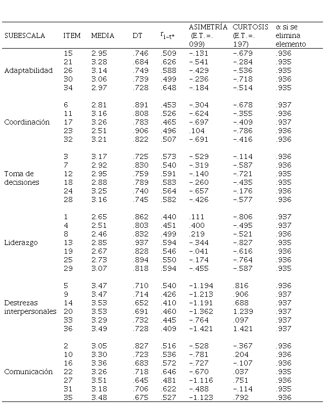 El presente estudio se propuso dar continuidad a la fiabilidad y validez de la estructura factorial de la versión original del cuestionario. En un primer momento, a través del análisis de los ítems que constituye la totalidad del cuestionario, se confirma la incorporación de todos los ítems del mismo. A continuación, se observa que la puntuación obtenida en cada ítem correlaciona positivamente con la alcanzada en el total de la escala, lo cual señala que no es necesario redireccionar en ninguno de sus enunciados el valor de las opciones de respuesta asignadas. Finalmente, la mayoría de los ítems muestran asimetría negativa (excepto los ítems: 1. Cuando trabajo en equipo, ejercito mi capacidad de liderazgo; 4. Cuando trabajo en equipo yo enseño a otros miembros del equipo; y 8. Cuando trabajo en equipo sirvo como modelo en las interacciones informales y formales), lo cual revela una predisposición a alcanzar valores altos en la prueba. Es decir, los individuos informan que en su vida cotidiana desarrollan las habilidades de trabajo en equipo evaluadas en el cuestionario, excepto el ejercer capacidad de liderazgo, enseñar a otros miembros o servir como modelo cuando se trabaja en equipo.