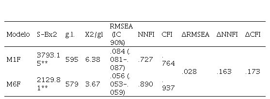 En consecuencia, se ponen a prueba dos modelos de medida alternativos (Tabla 3). Un primer modelo de seis factores hipotetizados a partir de los 36 ítems del instrumento original (M6F).