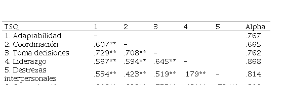Las correlaciones entre las seis dimensiones que conforman la escala TSQ fueron positivas y medio-altas (r entre .423 y .729), excepto la asociación entre el liderazgo y las destrezas interpersonales que fue muy baja (r=.179). No