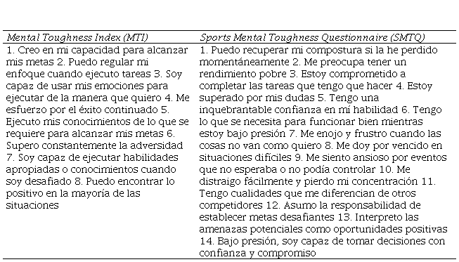 Los estadísticos descriptivos del Sports Mental Toughness Questionnaire y del Mental Toughness Index se muestran en la Tabla 2. En el SMTQ los promedios van desde 1.85 (DT=.830) del ítem 2 a 3.41 (DT=.659) del ítem 3. En el MTI la media más baja corresponde al ítem 3 (.=5.55, DT=1.200) y la más alta es 6.34 (DT=.965) del ítem 1.