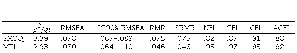 Por otro lado, a partir de los valores obtenidos encontramos que el SMTQ no obtiene un ajuste tan adecuado del modelo como el MTI. Aunque los índices de error son adecuados, ../df obtiene un valor superior a 3, y a excepción del Índice de Bondad de Ajuste (GFI), por escaso margen el resto de índices se sitúan por debajo de .90.