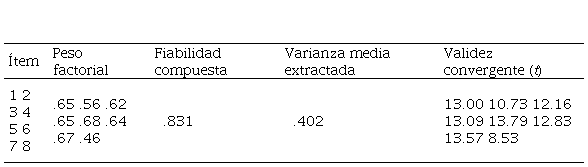 Para analizar las propiedad psicométricas y la validez de constructo, se realizó Análisis Factorial Confirmatorio (AFC) empleando el método de estimación de factores ULS (Unweighted Least Squares) (Jöresbog, 1977), y un análisis de componentes de varianza. Mediante estas pruebas se obtuvieron los diferentes índices de ajuste y error, concretamente, RMSEA (Error de Aproximación Cuadrático Medio), RMR (Residuo Cuadrático Medio), SRMR (Residuo Cuadrático Medio Estandarizado), NFI (Índice de Ajuste Normalizado), CFI (Índice de Ajuste Comparado), GFI (Índice de Bondad de Ajuste) y AGFI (Índice Ajustado de Bondad). Además de esos índices se estimaron la fiabilidad compuesta (grado de consistencia entre los indicadores con el constructo latente), varianza media extractada (cantidad de la varianza de los indicadores capturada por el constructo comparada con la capturada por el error de medida), validez convergente (validez de los indicadores utilizados para medir el constructo de interés), y validez discriminante (independencia de las variables latentes entre sí y que por tanto representan constructos diferentes).