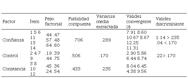 La fiabilidad compuesta resulta satisfactoria en el caso del MTI (.83). Sin embargo, no resulta así con las escalas del SMTQ, puesto que Control y Constancia obtienen valores bajos, .50 y .43 respectivamente.