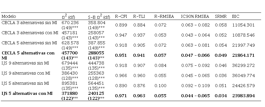 Se llevó a cabo un AFC de los instrumentos CECLA e IJS, mediante un método de máxima verosimilitud robusta, con los índices robustos Satorra-Bentler's chi-square approximation of goodness-of-fit (S-B χ²; Satorra & Bentler, 2010), Robust Comparative Fit Index (R-CFI), Tucker Lewis Index (R-TLI), con valores mínimos de ajuste de 0.90, y el Root Mean Square Error Aproximation (RMSEA, IC90%), y el Standarized Root Mean Square Residual (SRMR), con valores máximos de 0.08 (Hu & Bentler, 1999), y el Bayesian Information Criteria (BIC) (Schwarz, 1978), para identificar el mejor modelo a elegir. En la Tabla 1 se presentan los modelos con mejor ajuste según las variaciones propuestas en las escalas de respuesta entre tres y cinco para el CECLA, y cinco y nueve para el IJS (los dos instrumentos en las dos versiones fueron respondidos en el mismo aplicativo de Google Forms). Se destaca en ambos instrumentos, los modelos para las cinco opciones de respuesta con índices de modificación añadidos presentaron los mejores ajustes, pese a que el IJS originalmente contiene nueve opciones. Sin embargo, en términos generales todos los modelos presentaron ajustes adecuados para los análisis posteriores del estudio.