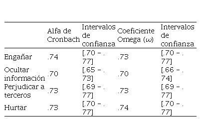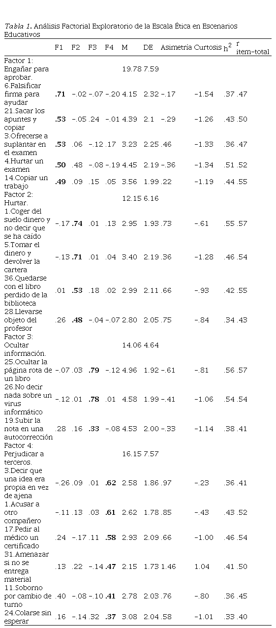 Tras la realización sucesiva de distintos análisis factoriales (AFE), la solución más satisfactoria al AFE se encontró con 18 elementos que se agrupaban en 4 factores. El número de factores se decidió teniendo en cuenta los requisitos marcados para los ítems y la facilidad para interpretar la solución. Los factores se denominaron “engañar para aprobar”, “perjudicar a terceros”, “ocultar información” y “hurtar”.