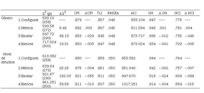 A continuación, se analizó la invarianza en función del género y el nivel de estudios. El objetivo era conocer si el modelo resultante se mantiene estable para varones y mujeres, por un lado, y para estudiantes de instituto y de universidad, por otro. Es decir, si existe invarianza en la estructura factorial de la prueba. Siguiendo a Milfont y Fischer (2010) se tomaron como criterios de toma de decisiones los valores de CFI, el Gamma-Hat (GH) y el índice de ajuste no centralizado (NCI), ya que permiten identificar la invariancia de los parámetros y no están influenciados por la complejidad del modelo, ni por el tamaño de la muestra. En este sentido, suponen buenos indicadores cuando los incrementos de un modelo a otro no son superiores a .01 para CFI, .001 para GH y .02 para NCI. Por último, para analizar las relaciones entre las dos variables, se realizaron pruebas de diferencia de medias (.-test para muestras independientes).