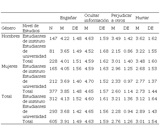 Por tanto, los 36 escenarios iniciales se redujeron a 18 ítems, de los cuales cinco correspondían a “engañar para aprobar”, seis a “perjudicar a terceros”, tres a “ocultar información” y cuatro a “hurtar”.