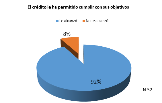 Para las 52 encuestadas el negocio fue la principal motivación para acceder al financiamiento. De acuerdo con los datos obtenidos en la encuesta, la mayoría buscaba iniciar (51.9%), expandir (30.7 %) o diversificar su negocio (7.6%) y sólo el 9,6% tuvo motivos ajenos a una actividad económica para solicitar el servicio.