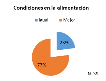 Respecto al impacto que el crédito ha tenido en los niveles de vida como es el caso de la alimentación se consideró un universo de 39 personas. Las 13 personas restantes corresponden a clientes de nuevo ingreso las cuales fueron excluidas de esta respuesta debido al poco tiempo que tienen de haber iniciado crédito con la Sofom y aún no vislumbran el impacto correspondiente. El 77% contestaron que sus niveles en la alimentación mejoraron porque tuvieron acceso a diferentes tipos de productos que antes no podían comprar.