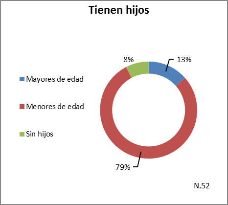 Con respecto a la familia se puede observar en la Figura 3 y 4, que la mayoría de las encuestadas tienen pareja (79%). Aunque un 21% dice no tenerla y eso sugeriría que son mujeres jefas de familia. Solo 8% no tienen hijos, mientras 79% son responsables de hijos e hijas menores de edad. Las familias con hijos e hijas mayores de edad son 13%. Los datos sugieren que los grupos con responsabilidades familiares son las más necesitadas para obtener créditos. Se trata sobre todo de mujeres en edad reproductiva.