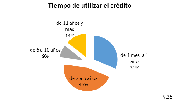 La primera pregunta de este apartado estuvo dirigida a averiguar si anteriormente habían solicitado crédito a otras instituciones. La respuesta que dio el 67% fue que conoce y ha tenido crédito de antemano. A fin de conocer desde cuándo han contado con financiamiento se les formuló una pregunta adicional. Treinta y cinco personas respondieron a la pregunta, el porcentaje más alto se ubica entre los que tienen –relativamente- poco tiempo accediendo al financiamiento. De tal manera que aun cuando un importante porcentaje manifestó cierta experiencia crediticia, los datos relativos al tiempo durante el cual se ha acumulado esa experiencia nos dejan ver que apenas una cuarta parte ha utilizado el financiamiento desde hace más de 6 años.
