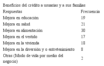 Con respecto a los beneficios que las personas han alcanzado con los créditos se les cuestionó lo siguiente: ¿Qué beneficios le ha traído a usted y a su familia utilizar el crédito? En esta pregunta se excluyeron a las personas de nuevo ingreso (13) dado que se considera que tienen poco tiempo operando el crédito y por lo tanto no se le pueden atribuir algún impacto en el bienestar. Respondieron la pregunta 39 personas. En el Cuadro 1 se reflejan las frecuencias en sus respuestas.