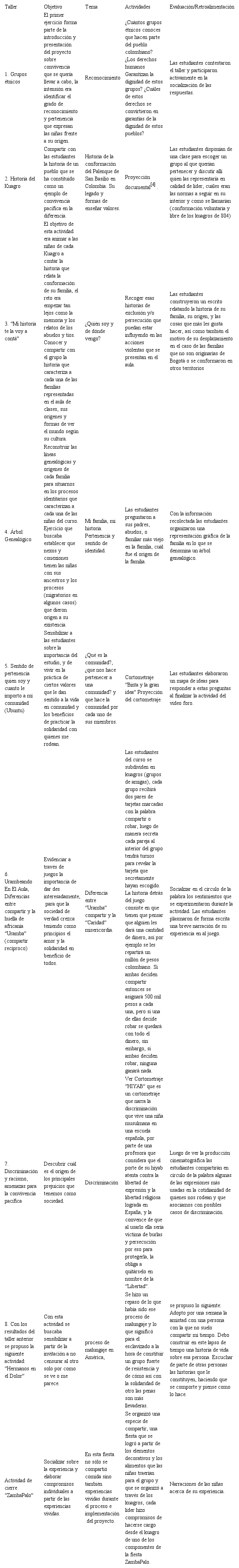 En este ejercicio, las niñas se notaron algo temerosas por compartir sus experiencias. Algunas de ellas no tenían los datos suficientes para reconstruir su historia, pero proponían hacer la labor investigativa, y completarla en casa, con la ayuda de sus padres y abuelos, de manera que la próxima sesión presentarían esos resultados. Los ejercicios permitieron conocer y compartir con el grupo la historia que caracteriza a cada una de las familias representadas en el aula de clases, sus orígenes y formas de ver el mundo según su cultura. Pudimos recoger esas historias de exclusión y/o persecución que pudieron estar influyendo en las acciones violentas que se presentan en el aula. Logramos reconstruir las líneas genealógicas y orígenes de cada familia para situarnos en los procesos identitarios que caracterizan a cada una de las niñas del curso.