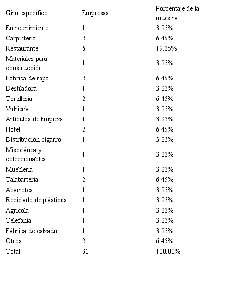 En la ciudad de Arandas, Jalisco, predomina la actividad agrícola, y en las últimas décadas la Industria Tequilera, calzado, mueblera, bolsa, entre otras; sin embargo, es fácil identificar el crecimiento acelerado de las microempresas, principalmente comerciales y servicios. En el Cuadro 2 se observa la diversidad de giro que se pueden encontrar, proliferando el de restaurantes con un 19.35% (acorde a la muestra tomada).