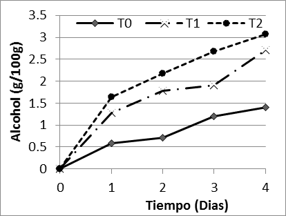 Los gránulos de kéfir fermentaron aproximadamente el 45% del total de los azúcares (Figura 1) disponibles mientras que la cepa de K. marxianu, dieron por resultado solo una pequeña producción al cuarto día de 0.39 ± 0.03 en el T3, en el T4 una producción de 0.41 ± 0.06 y 0.54 ± 0.04 en T5.