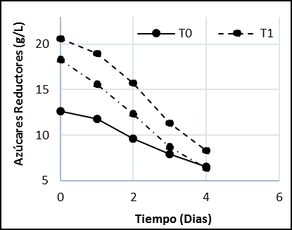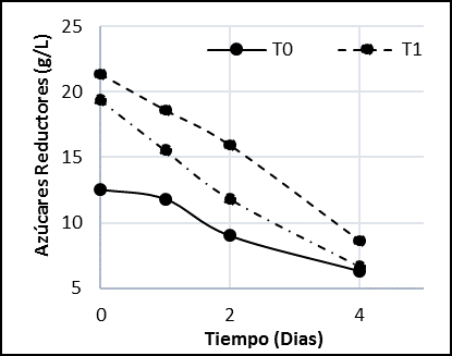 Finalmente, en las Figuras 2 y 3 se presenta el consumo de los azúcares reductores durante la fermentación. Estadísticamente hablando se observa que los seis tratamientos no presentaron una diferencia significativa entre sí.