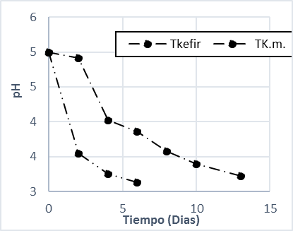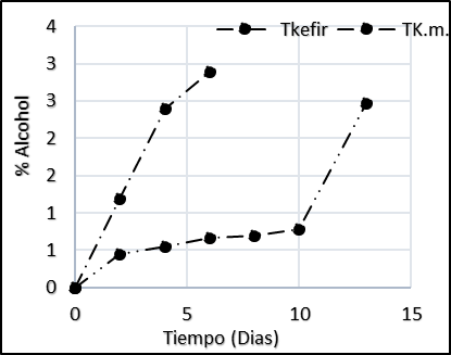 En cuanto a la producción de alcohol, en Tkéfir se obtuvo una concentración de 2.9%, en tanto para TK. marxianus fue de 2.47%, (Figura 6) lo que muestra que sí hubo una diferencia significativa ya que el valor de p que es 0.000 fue menor a 0.05, esto, debido a que los microorganismos presentes en los tratamientos tienen diferentes índices de producción de alcohol etílico.