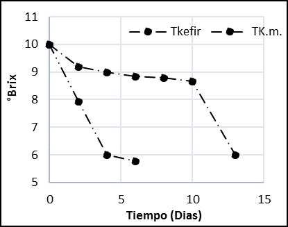 En el consumo de azúcares reductores hubo una diferencia significativa debido a que la cepa de Kluyveromyces marxianus es especializada en fermentar los azúcares reductores y aun cuando en los gránulos de kéfir existen levaduras capaces de fermentar dichos azúcares la proporción de la cepa de K. marxianus en el tratamiento siete es mucho mayor con respecto a las que se encuentra en los gránulos de kéfir.
