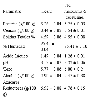 Características fisicoquímicas y sensoriales de los tratamientos seleccionados para la elaboración de las bebidas. Al comparar los resultados finales de ambas formulaciones se observó que no hubo una gran diferencia significativa entre las características físicas y químicas (Cuadro 2), dos de las diferencias principales fue una en el consumo de azúcares reductores en el caso de la combinación de cepas de K. marxianus-S. cerevisiae por lo que significa que la bebida formulada con gránulos de kéfir presenta una mayor cantidad de galactosa y lactosa principalmente. La otra diferencia significativa fue en la producción de etanol la formulación que tenía K. marxianus-S. cerevisiae produjo menos alcohol etílico que su contra parte.