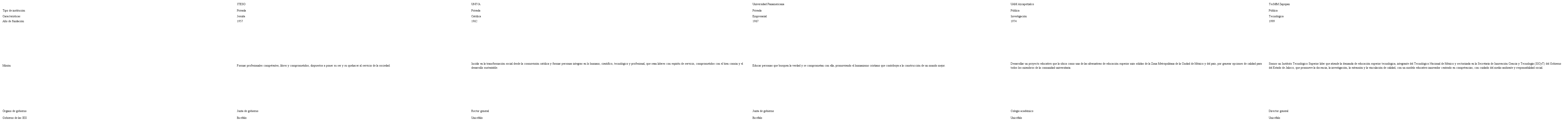 Se eligieron a la Universidad Autónoma Metropolitana campus Azcapotzalco (UAM), y al Instituto Tecnológico Mario Molina Campus Zapopan (TecMM Zapopan) como instituciones públicas. Mientras que de las privadas se eligieron al Instituto Tecnológico y de Estudios Superiores de Occidente (ITESO), la Universidad del Valle de Atemajac (UNIVA) y la Universidad Panamericana campus Guadalajara (UP). En el caso de la UP, se realizaron dos entrevistas, una al Rector y otra a la vicerrectora, para poder contemplar una visión femenina. Otro punto por aclarar antes de continuar es que se tenía planeada otra entrevista a una universidad pública de la cual no se obtuvo respuesta favorable, por lo que para el estudio sólo se tomaron dos públicas y tres privadas.