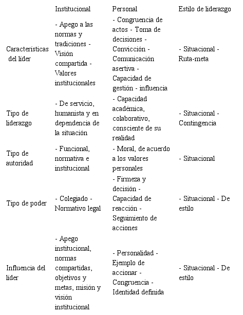 Esta serie de rasgos establecen las facultades que tiene, o debe tener un líder para ejercer el poder y la autoridad. Según sea el caso, el sentido del poder y autoridad que profesa el líder en su espacio de trabajo, guarda una relación directa con el estilo de liderazgo en las organizaciones (García, 2009). Cada institución puede tomar diferentes posturas sobre el accionar del líder con la autoridad y el poder, desde una concepción institucionalista, “Ajustándose plenamente a la legislación universitaria, el poder debe ser el poder de lo académico y no los intereses de grupos, y sin permitir, en este caso, que los que ostentan esta facultad, puedan ejercerla de una manera inadecuada.