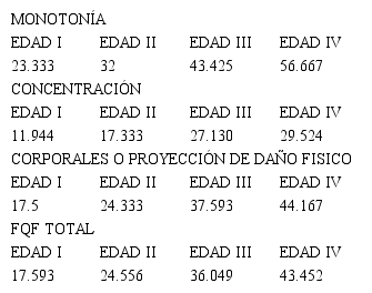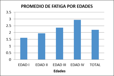 Se encontró que el grupo de edad I presenta fatiga de (1.6111), el grupo de edad II presenta fatiga de (1.9333), mientras que el grupo de edad III presenta una fatiga de (2.3518), y en el grupo de edad 4 la fatiga que nos arrojó fue de (2.9286). Se agruparon las edades en 4 grupos con los intervalos de edades anteriormente mencionadas.