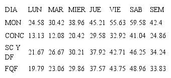 Siguiendo el mismo procedimiento que en el punto anterior, se encontró que el porcentaje de frecuencia de quejas por fatiga que presentan los pescadores según los días es diferente entre ellos. Se encontró que el día sábado es el día que se presenta el mayor porcentaje de FQF (48.96), que el día viernes presenta un porcentaje de FQF de (43.75), que el día jueves presenta un porcentaje de FQF DE (37.57), que el día miércoles presenta un porcentaje de FQF de (29.86) y que los días martes el porcentaje de FQF es de (23.06) y los días lunes el porcentaje de FQF es de (19.79) el cual es el más bajo de la semana.
