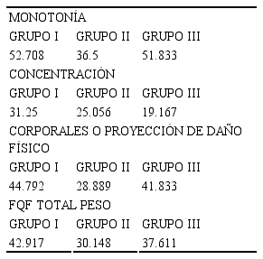 Siguiendo el mismo procedimiento del cuestionario de Yoshitake, se encontró que la fatiga que presentan los pescadores según su peso en kilogramos es diferente para los tres grupos en los que se dividió de acuerdo a su peso, grupo I comprende a los pescadores que pesan entre 60 y 70 kilogramos los cuales presentaron Un porcentaje de FQF de (41.9166), el grupo II que comprende a los pescadores que pesan entre 71 y 80 kilogramos presentaron un porcentaje de FQF de (30.1481), mientras el grupo tres formado por los pescadores con peso de 81 kg y más presentaron un porcentaje de FQF de (37.611), concluyendo así que los del grupo uno presentan mayor porcentaje de FQF (Frecuencia de quejas por fatiga).
