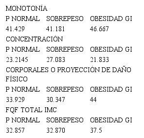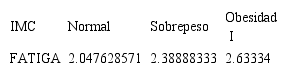 De acuerdo al procedimiento utilizado en el punto antes mencionado, se encontró que la fatiga que presentan los pescadores con peso normal es de (2.0476), la fatiga en los pescadores con sobrepeso es de (2.3888) y los pescadores con obesidad grado I presentan una fatiga de (2.6333), por lo que se observa que existe un incremento de acuerdo en su incremento de IMC.