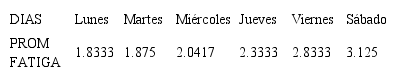 En base al estudio realizado se puede mencionar que el promedio de fatiga utilizando el método de los cuatro puntos de Luke es distinto entre los días y que va aumentando conforme pasa la semana, se encontró que el día 6 es el día que se presenta la mayor fatiga, el día 5 presenta fatiga media alta, el día 4 presenta fatiga media alta, el día 3 presenta fatiga media y los días 1 y 2 presentan fatiga media baja.