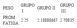 Se encontró que la fatiga que presentan los pescadores según su peso en kilogramos es diferente para los tres grupos en los que se dividió de acuerdo a su peso, grupo I comprende a los pescadores que pesan entre 60 y 70 kilogramos los cuales presentaron una fatiga de (41.9166), el grupo II que comprende a los pescadores que pesan entre 71 y 80 kilogramos presentaron una fatiga de (30.1481), mientras el grupo tres formado por los pescadores con peso de 81 kg y más presentaron una fatiga de (37.611).