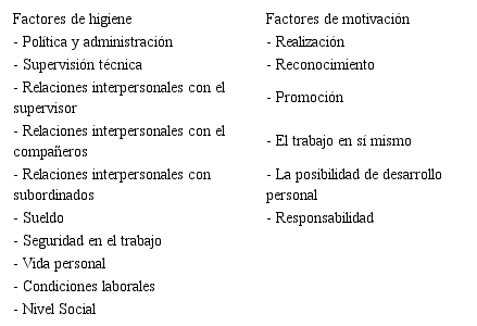 El psicólogo estadounidense, llegó a la conclusión de que existían diez factores de higiene (mantenimiento) que se centran en el contexto del empleo y seis factores de motivación inherentes al contenido del empleo (Velázquez Mastretta, 2013), como se muestra en la siguiente tabla: